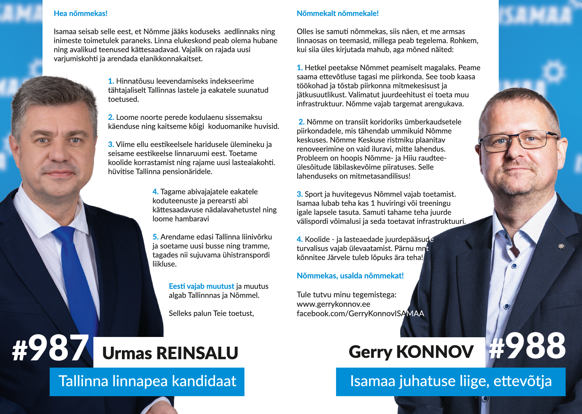 Kandideerin KOV valimistel Isamaa Tallinna nimekirjas NÕMMEL. Sinu kandidaat nr. 988.